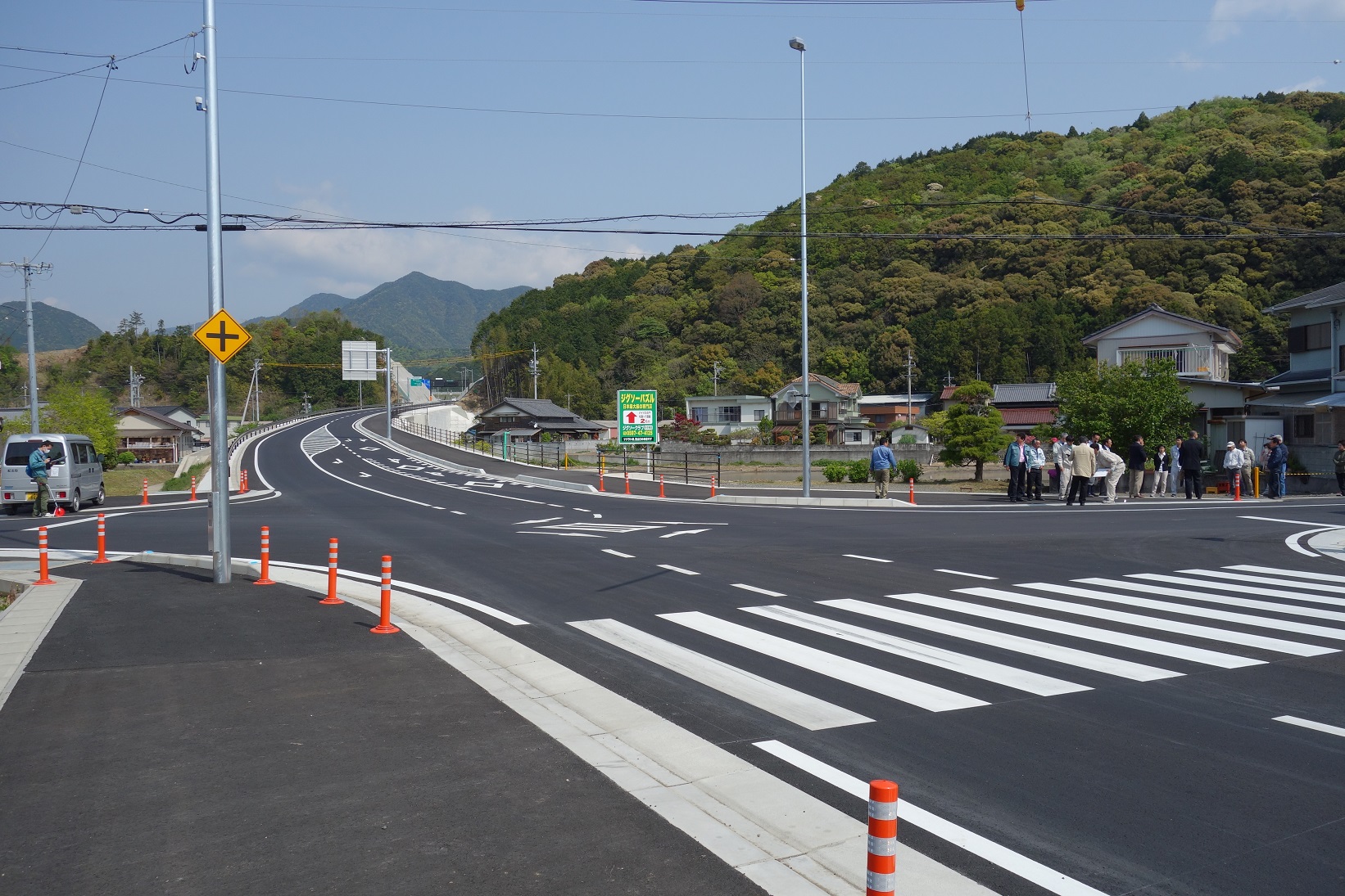 4月19日(金)午前9時半、紀伊長島区山本地内の自動車道インター線交差点に信号機を新設するための設計作業に入り、現場確認作業が行われました。関係者(県警本部交通規制課、尾鷲警察署交通課、尾鷲建設事務所、町教育長、東小学校長、町建設課、町危機管理課、町教育委員会、地元区長、地元住民の方々そして地元町議会議員)の大勢の皆さまの立ち合いで行われ、3月24日にインター線開通後の交通量は予想を1.5倍も上回っていることや、地元では一刻も早い事故防止策の取り組みを願っていることなどが話されていました。