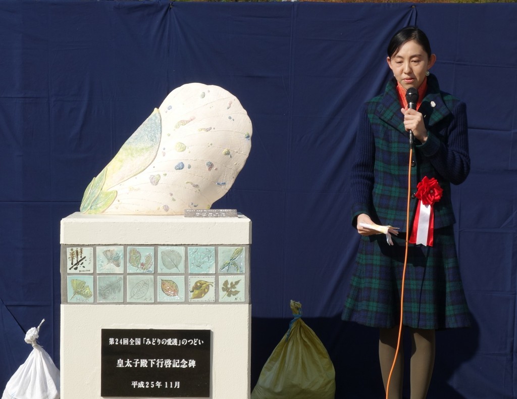 11月24日、道の駅『紀伊長島マンボウ』芝生広場に半磁器のモニュメントが設置され、大勢の見物客で賑わいました。記念イベントも同時開催され大変な盛り上がりでした。紀伊長島には40年前に開催された彫刻シンポジュームの作品をはじめ数多くのアート作品が設置されていますが、今回の新たな作品『Feel the Breeze』もきっと多くの来訪者の注目を集めることでしょう。作者は姫路市在住の造形作家・西川都子(さとこ)さんで『みどりの愛護』にふさわしく、白を基調に精巧な彫りを施し、芽生えた種がそよ風を受けて自然の恵みを感じているようでした。紀北町に2カ月滞在し制作されたものです。