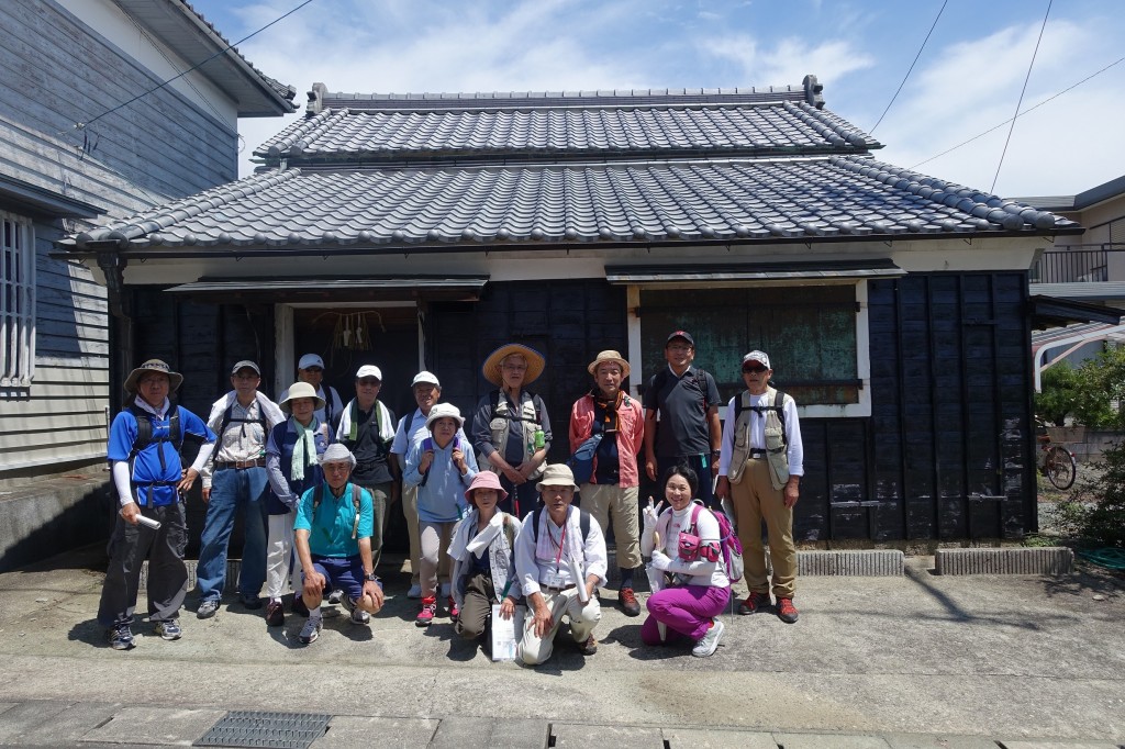 7月12日(土)大台町内の栃原から三瀬谷まで14㎞を106人で5時間かけて歩きました。5グループに分かれて其々に地元の語り部さんに案内してもらいました。写真は栃原にある江戸時代から続く老舗旅館岡島屋の向かいに建っている岡島屋所有の蔵の前です。その語り部さんは偶然岡島屋さんの御主人でした。グループの中に尾鷲や熊野で顔なじみの方もいらっしゃいました。下楠にある旧旅館阿波屋の鬼瓦には七福神が乗っていたり、馬鹿曲がりや明治40年に作られたレンガの眼鏡橋もあったりして楽しめました。でも暑かったです。