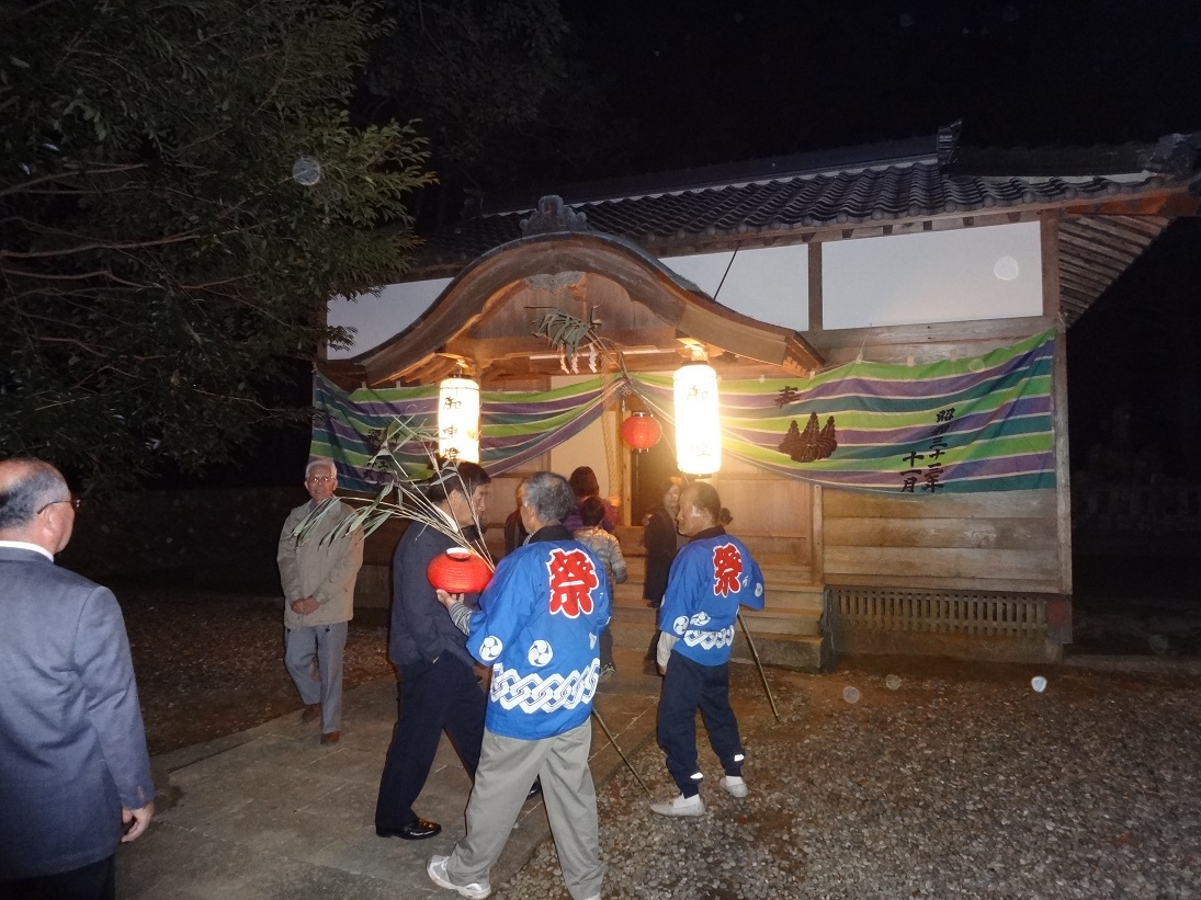 曾根町の付近は、縄文遺跡が出土するほど人々は古くから漁労で暮らし、豊かな海の幸に恵まれたところです。飛鳥神社は1200年以上の歴史を有するそうですが、境内の樹叢にはクスノキ、スギなどの大木や、シマクロキ、バクチノキ、ムクロジなど紀伊半島の温暖な気候に育まれた樹種が混生していて、三重県の天然記念物にも指定されています。11月14日の夜7時30分に、曾根公民館から、賀田区・梶賀区・曾根区長さん達を先頭に提灯行列で飛鳥神社へ向かい団体詣でに参加しました。大変風情のある宵祭りの雰囲気を楽しませていただきました。