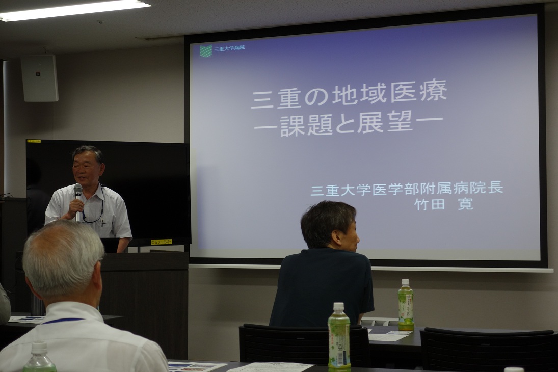7月2日三重大学医学部附属病院長の竹田寛先生からお話を伺いました。場所は24年1月に開院したばかりの入院病棟最上階(12階)会議室です。課題は①医師不足と偏在②看護師不足③救急医療です。中でも医師不足については東紀州の抱える問題ですが、今後は県全体では改善方向にあるようですが、南部地域については厳しい状況が続くとのことです。三重大学医学部の対応としては、県内出身者を増やすために定員125名の内地域枠を35名分設けていて、また奨学金制度の導入や地域医療教育の充実などに取り組んでいます。今後平成26年度には新外来診療棟も開院予定で施設の充実が図られるようです。