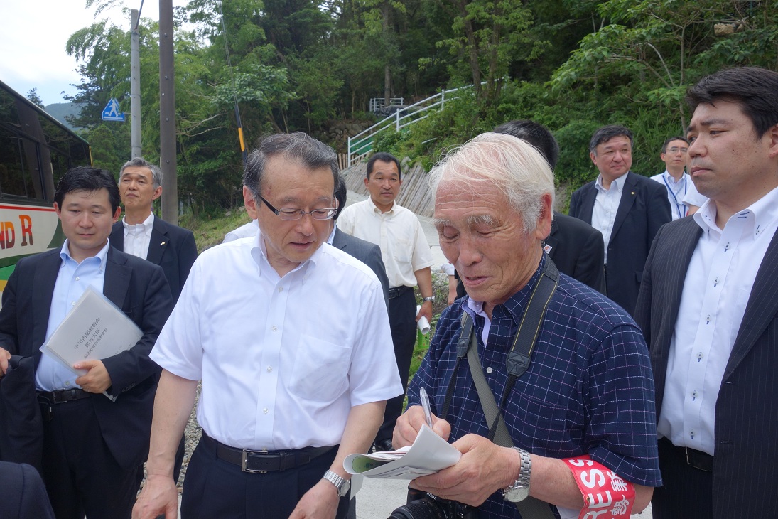 活動報告 中川防災大臣来町、相賀地区避難路調査 2012.07.09 7月8日午後2時半、中川防災大臣が紀北町海山区相賀地区の住民と地元企業が協同作業で作った避難路の調査に立ち寄りました。梅雨の晴れ間ということで非常に暑い時間帯でしたが、避難路を登り海抜32.5メートルまで歩きました。町長さんや地元自治会長さんが避難路づくりの経緯について説明し、また今後の課題などについても話していました。終わり頃には某新聞社の某記者がぶら下がって大臣の感想などを聞いていました。ちなみにぶら下り取材は禁止されていたようですが… 記事のタイトルとURLをコピーする 事前復興について、東大都市工学科准教授羽藤研究室訪問 前の記事 中川防災大臣大紀町錦の避難タワー視察 次の記事
