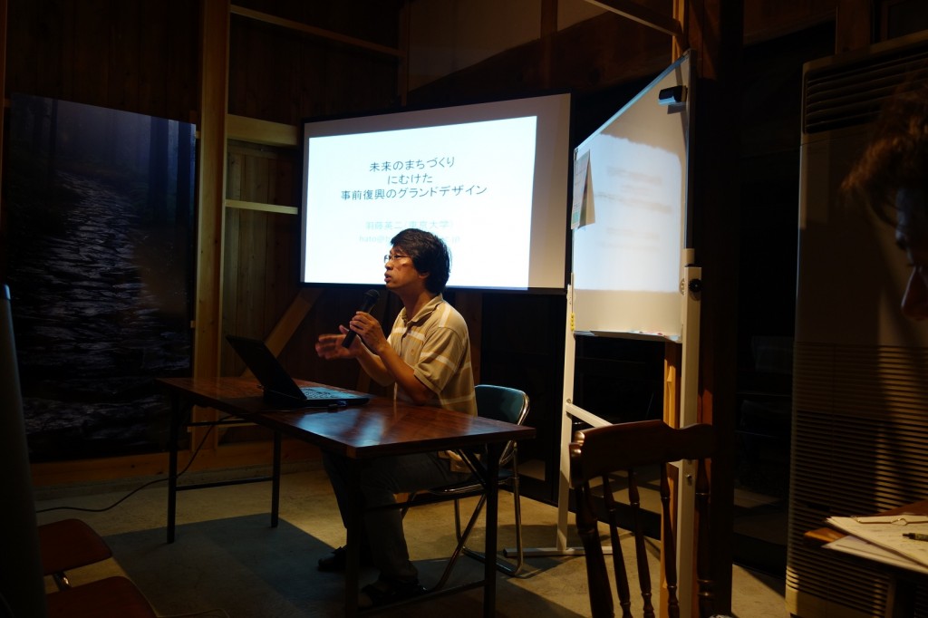 9月17日、ゆうがく邸のギャラリーで、未来のまちづくり勉強会が開催され、地震と津波に備えるまちづくりについてのお話がありました。災害が起きる前から発生を意識してまちづくりを進める、いわゆる事前復興の必要性を実感しました。陸前高田の復興計画がなかなか進まない現実から、平常時に住民が冷静に災害後のまちづくりを語り合っておくことの必要性と住民同士が交流を深めておくことや、祭りを続けるプライドの必要性などもお話しくださいました。本来の専門は交通工学だそうですが、幅広く活動している様子がうかがえました。また9月には教授になられたそうで、45歳で東大教授とはすごいです。引き続き東紀州に繋がりを持っていてほしいので、次回はテーマを絞り(30年後の都市・交通計画の実践や社会基盤整備など)でゼミ形式で取り組んでもよいかもですね。